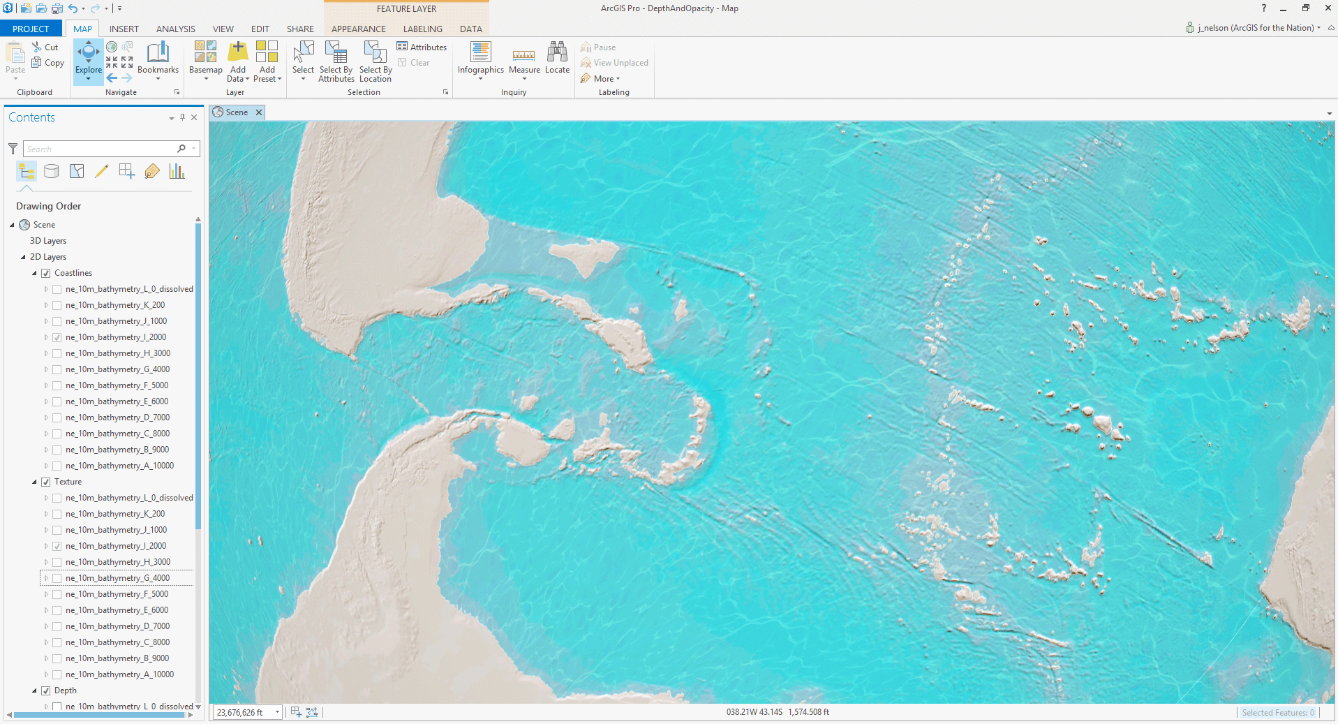 Here is a quick and dirty transparency applied to all of the bathymetry layers. Each layer is 75% transparent (15% opaque). I’m liking it!! It has a milky diffusion that more directly illustrates depth -shallow seafloors showing through more strongly with deeper areas pooling up a greater opacity.