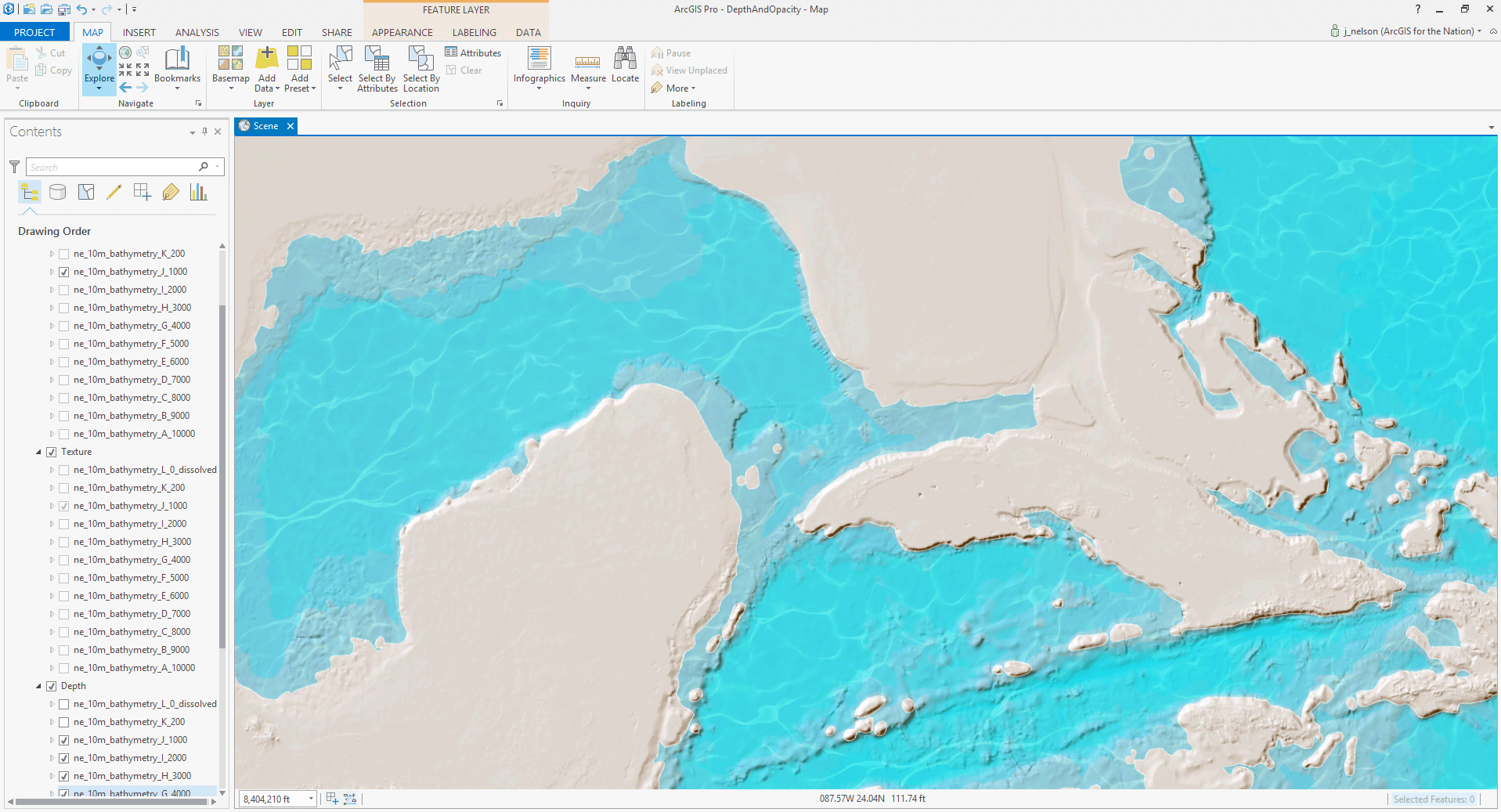 But it IS A GIS! Which means you can delve into terraforming, and grin confidently while you do it. Since you have all the layers representing your additive depth, you can peel back those layers (remember to show the reflective and coastline layers for only the topmost depth you want to illustrate -take a close look at the table of contents in the images below to see what I mean).