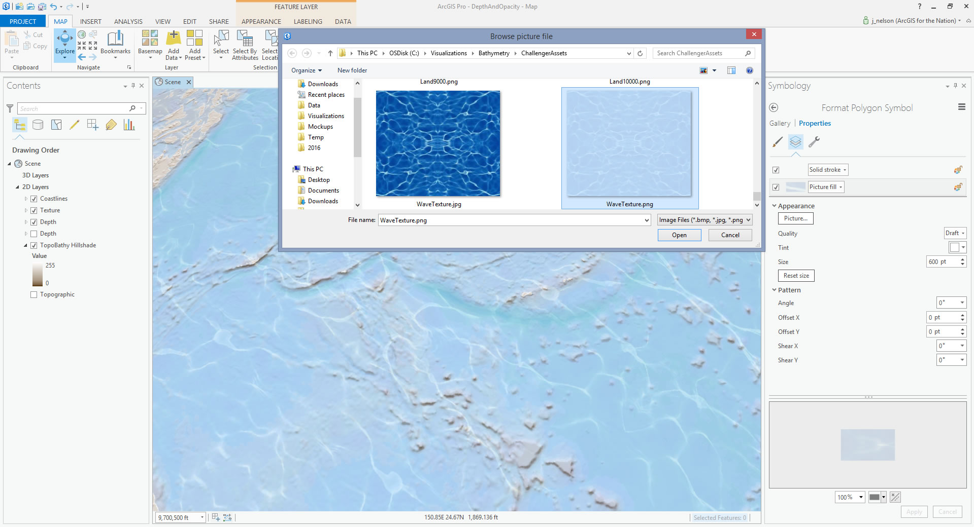I duplicated the top-most bathymetry shapefile (sea level) and rather than a semi-transparent color fill, I’ve chosen “Picture Fill” to use as a surface texture. You can adjust the size of the image tile to get a scale that suits you. Note, if you adjust the “angle” of the picture fill, it goes a long way to breaking up the appearance of a repeating pattern that wrecks your illusion.