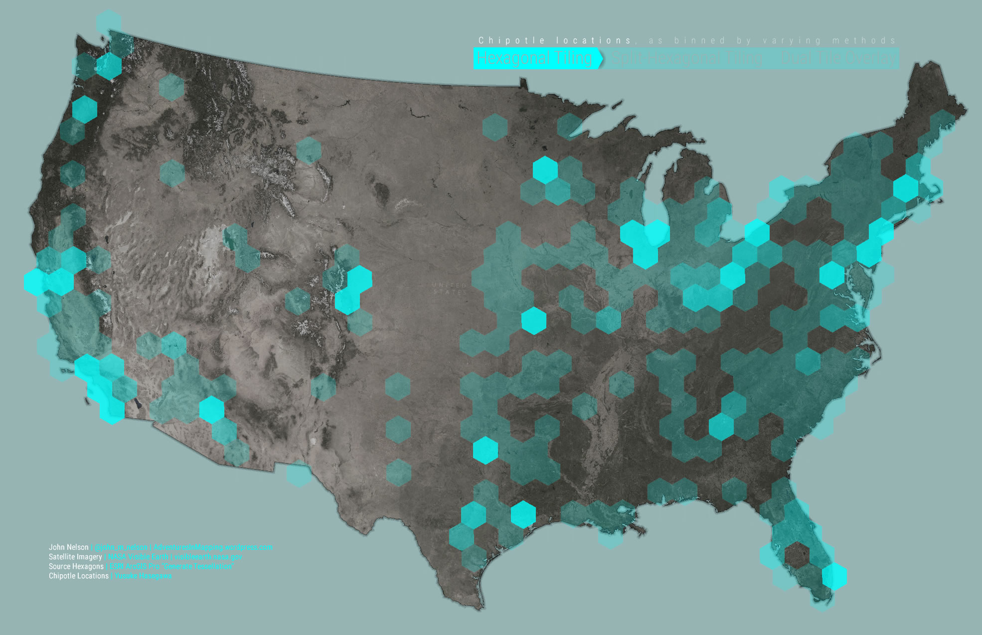 Here is what all those Chipotles look like binned up into vanilla hexagons. Nice, standard, hex map: