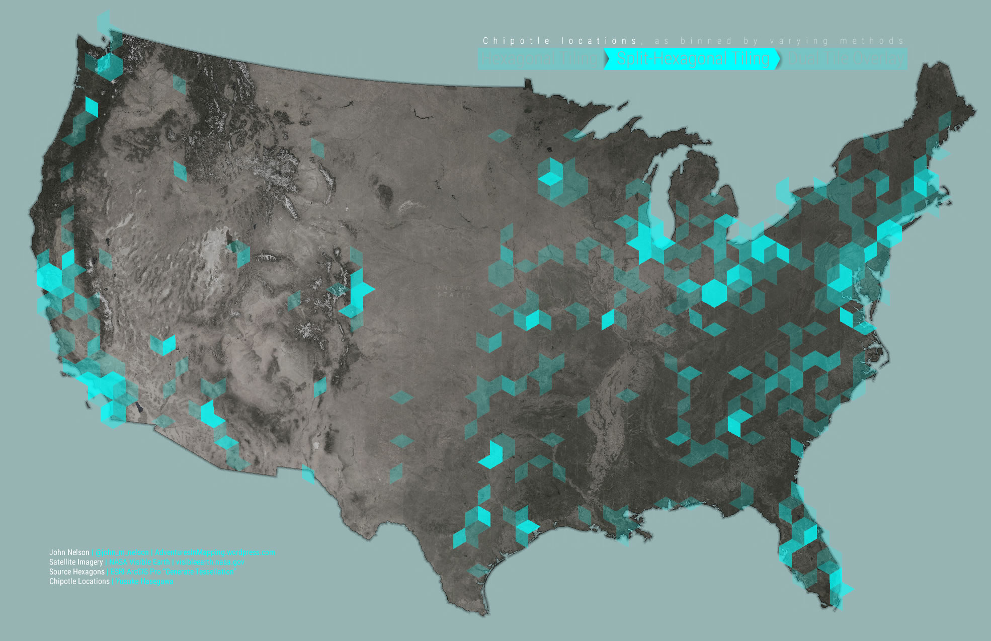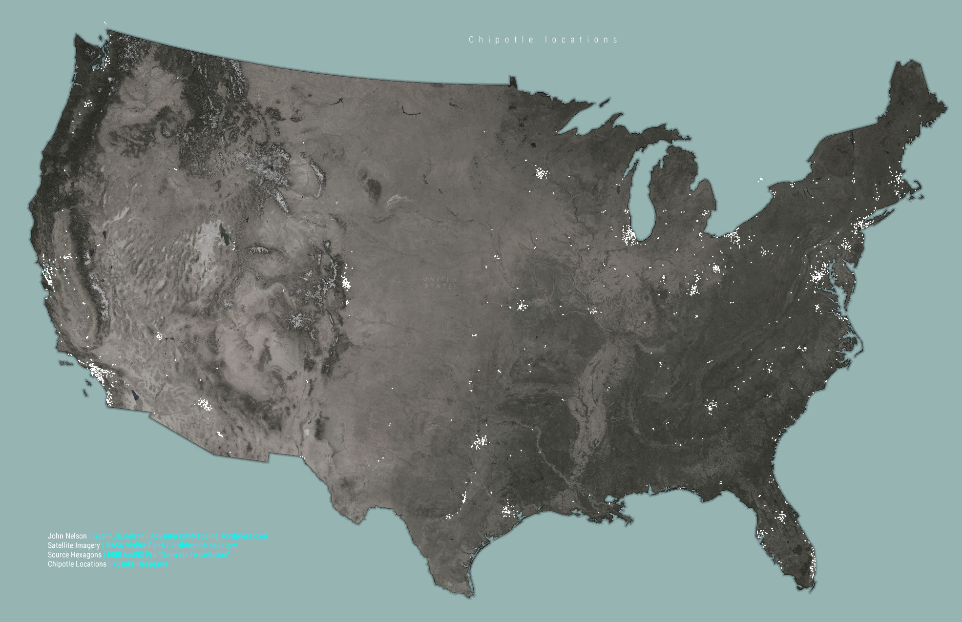 Here’s another look. This time with the Chipotle locations turned back on for reference. I like how the overall density shows via the hex cells. But where there are more Chipotles on one side or another, that corner of the cell glows brighter (click to embiggen):