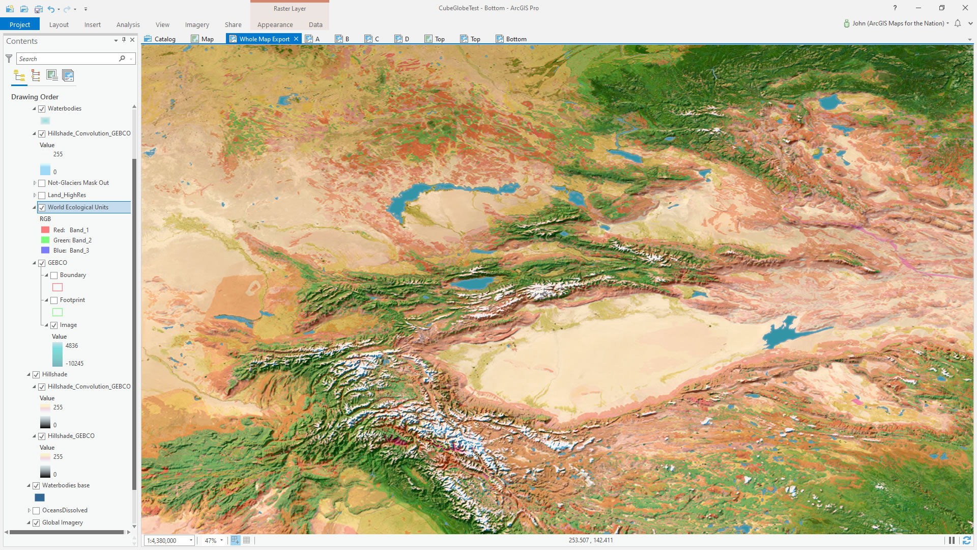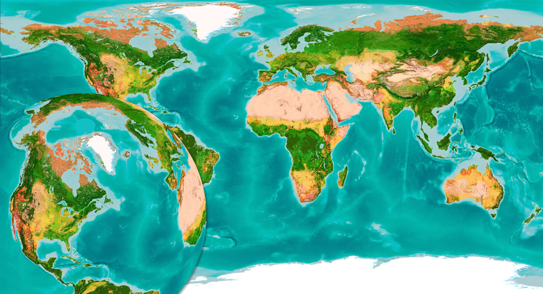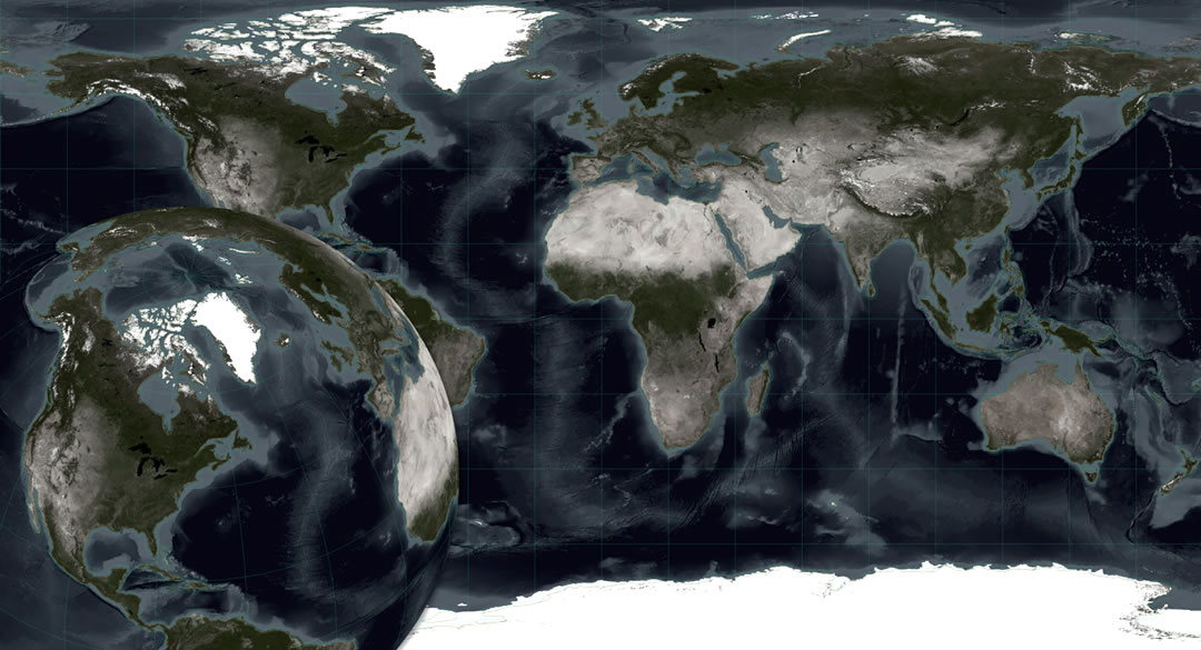 Ultimately the bold imagery option was chosen. What makes it bold? Well it’s actually the World Ecological Land Units doing the heavy cartographic lifting. This global scientifically-derived segmentation of land cover was created by colleagues here at Esri in collaboration with the USGS, academic experts, and conservation foundations. It was given a color-boosting saturation push and overlain atop world imagery. GEBCO bathymetric data provided oceanic areas (come on, that’s 70% of the globe!) a sense of layered depth. Over all this was a bumpification layer to draw up a sense of relief texture with warm sunlit slopes in terrestrial areas, cool icy shadows in glaciated areas, and aqua-drenched bathymetric shading.