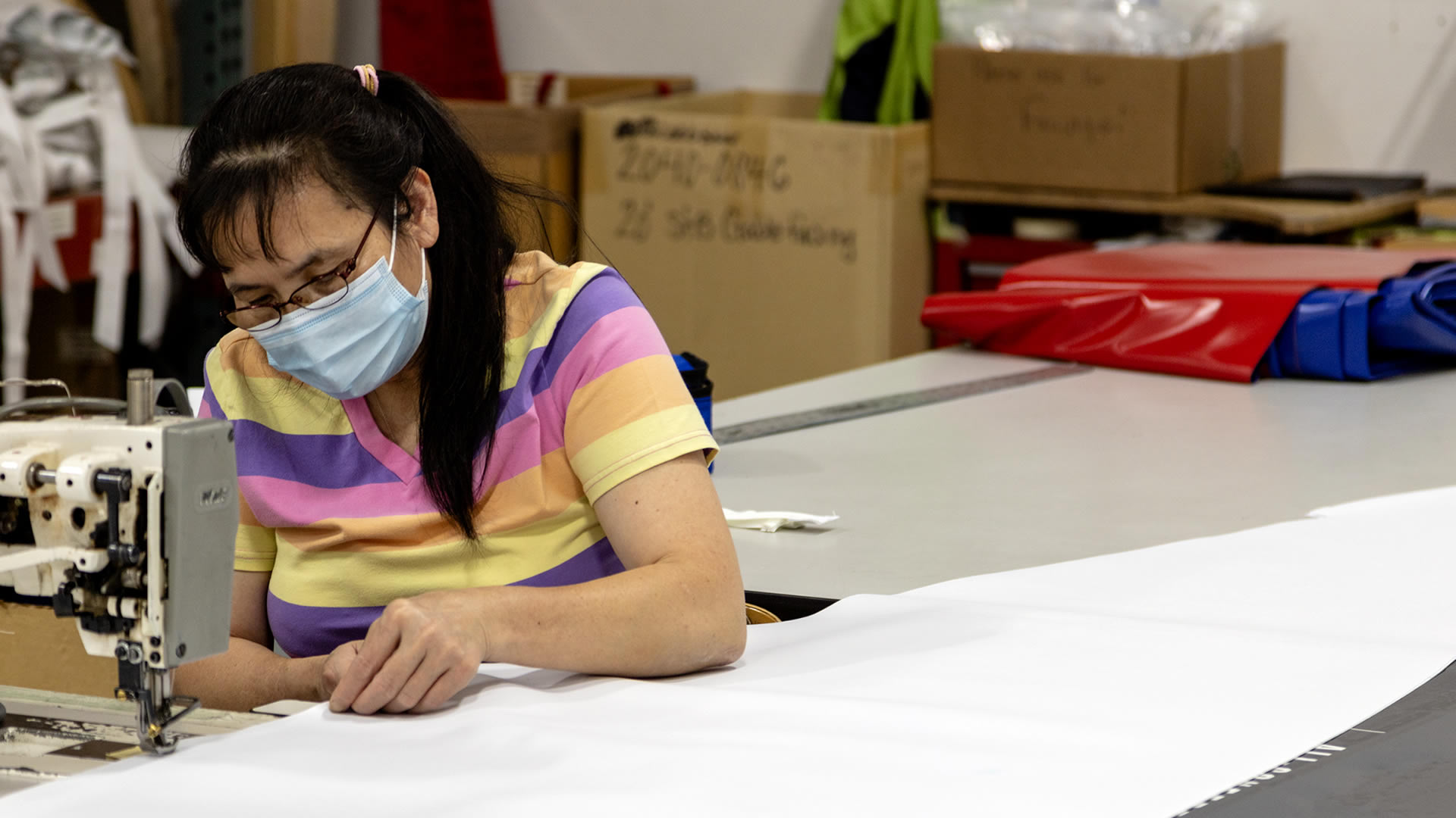 All of these gores were printed and trimmed and prepped for…assembly. Assembly? Well, like any creative process, there is the wonderful application of care and craft and adept and practiced hands. Look at these lovely flat elements being expertly stitched together into something with form and depth…
